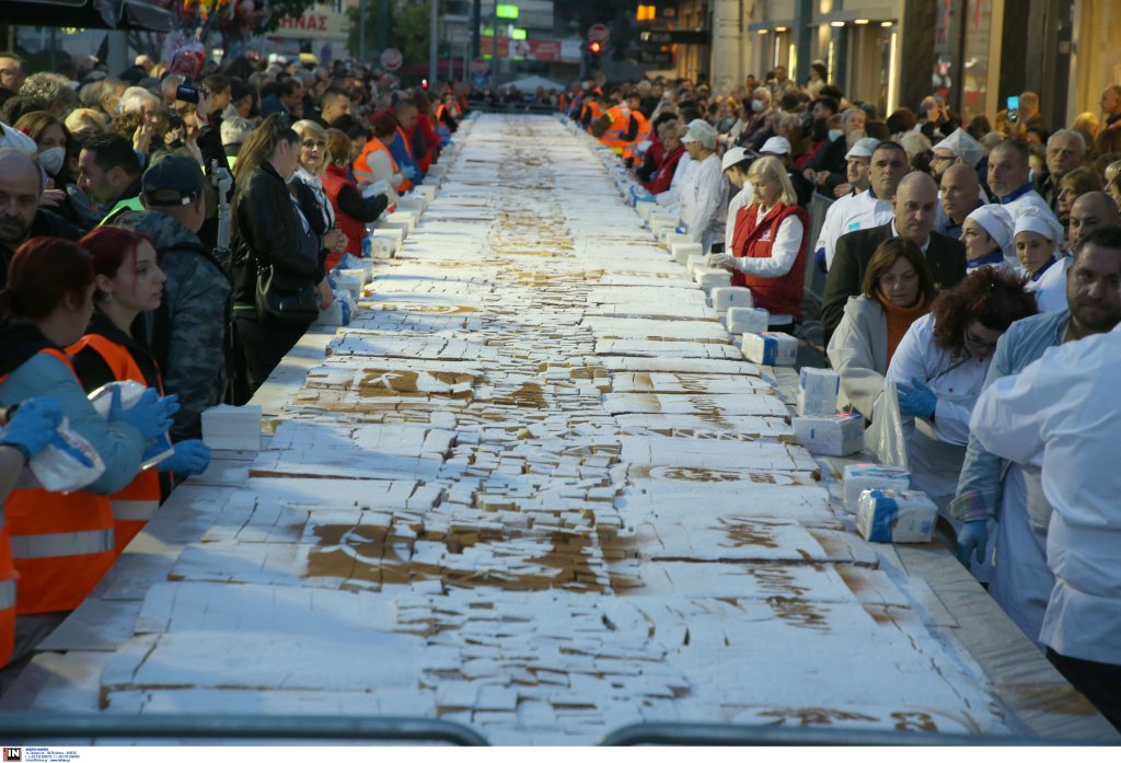 Μια παράδοση που ξεκίνησε πριν λίγα χρόνια συνεχίζεται στο Περιστέρι! Και φέτος δημιουργήθηκε μια τεράστια βασιλόπιτα με περισσότερα από 50.000 κομμάτια καλύπτει όλο το μήκος της οδού, παράπλευρα από την πλατεία Δημαρχείου. Μάλιστα, ξεπέρασε τους 7 τόνους βάρος και είχε 200 φλουριά που αντιστοιχούσαν σε πλούσια δώρα!