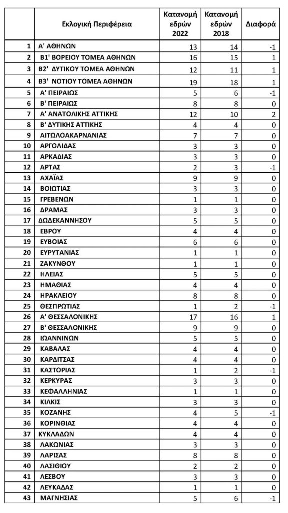 Δείτε παρακάτω τον πίνακα με την κατανομή των εδρών που διαμορφώνει τον νέο εκλογικό χάρτη της χώρας για την επόμενη εκλογική διαδικασία.