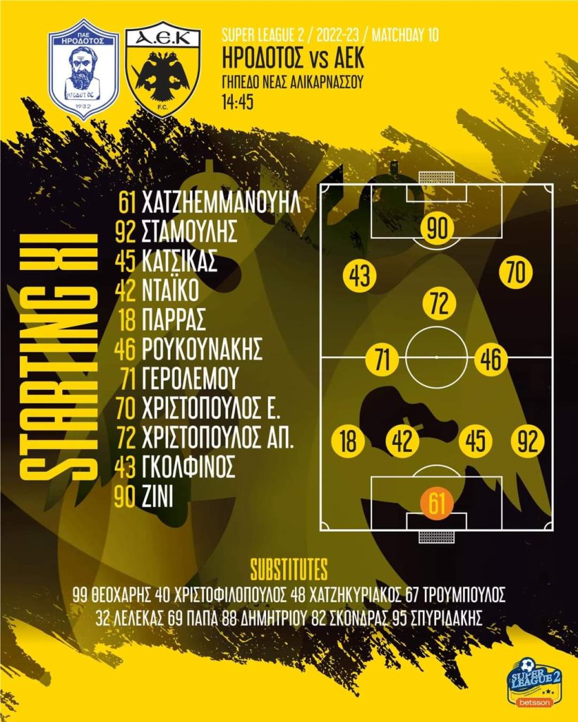 Η ενδεκάδα που επέλεξε ο προπονητής της ΑΕΚ Β Σωκράτης Οφρυδόπουλος για τον αγώνα της 10ης αγωνιστικής της Super League 2 με αντίπαλο τον Ηρόδοτο στο Ηράκλειο.