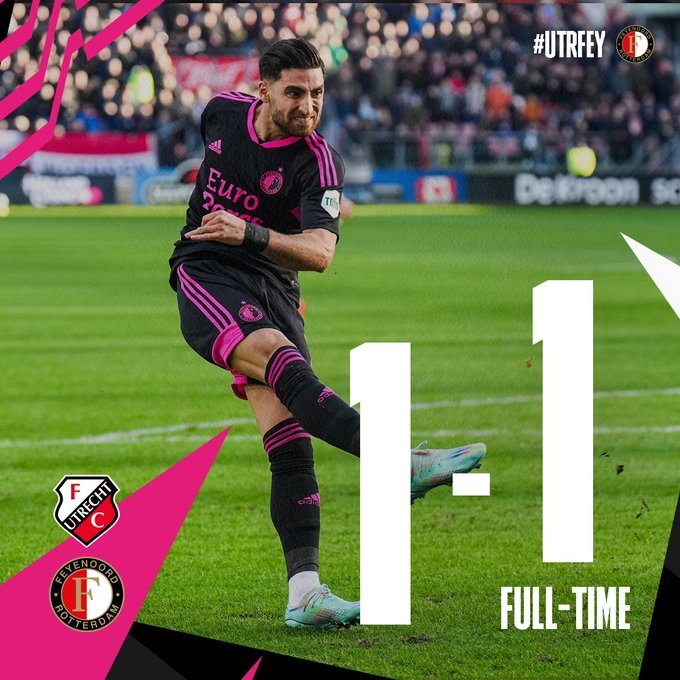 Στο Ουτρέχτη-Φέγενορντ, οι γηπεδούχοι άνοιξαν το σκορ, μόλις στο τρίτο λεπτό, με τον Ντοστ να βρίσκει, εξαιρετικά, σε θέση βολής τον Τόορνστρα και εκείνος να σκοράρει για το 1-0. Στο 11ο λεπτό, η Φέγενορντ είχε δοκάρι με τον Ντανίλο και στο 74ο λεπτό ο Βασίλης Μπάρκας μπλόκαρε προσπάθεια του Χιμένες για την ισοφάριση. Ο γκολκίπερ της Ουτρέχτης αντέδρασε αποτελεσματικά και στην εκτέλεση φάουλ του Σιμάνσκι, στο 79', με τον Γιάχανμπανκς να εξασφαλίζει τον βαθμό στη Φέγενορντ, σκοράροντας στο πρώτο λεπτό των καθυστερήσεων. Μάλιστα, στο έκτο λεπτό των καθυστερήσεων, ο Μπάρκας, με μια εξαιρετική επέμβαση, δεν επέτρεψε στην πρωτοπόρο να φτάσει στην ολική ανατροπή και το 1-1 έμεινε μέχρι το φινάλε.