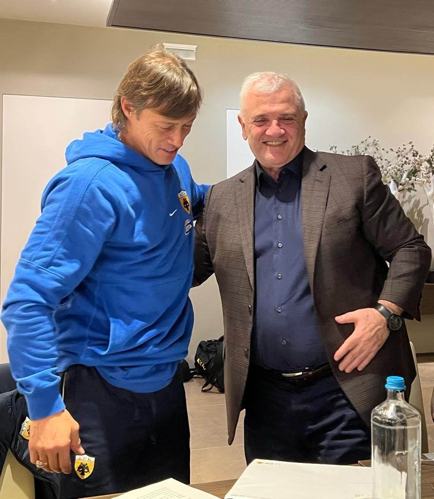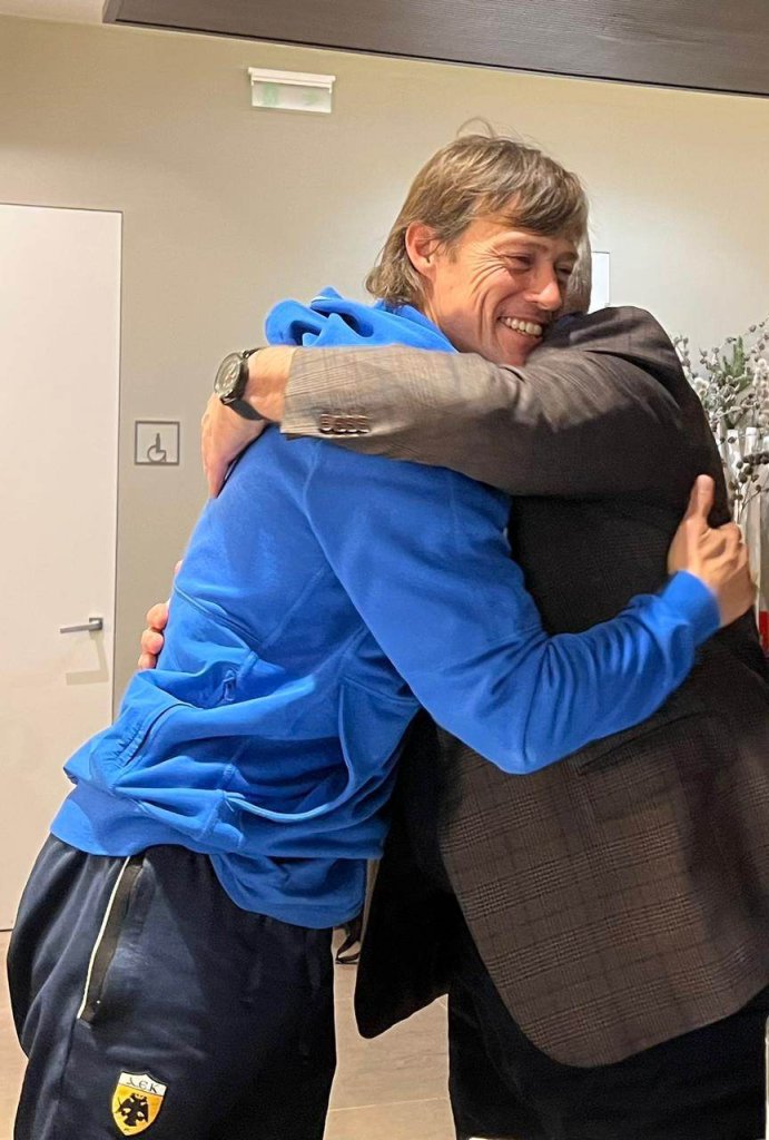 Ο Ματίας Αλμέιδα υπέγραψε πολυετές συμβόλαιο με την ΑΕΚ με επέκταση της συνεργασίας μέχρι το 2028 και φυσικά η ιστορική αυτή στιγμή αποθανατίστηκε. Ο Αργεντινός προπονητής με το χαμόγελο στα χείλη υπογράφει το συμβόλαιο του, χαρακτηρίζοντας αυτή τη στιγμή ως μια από τις πιο ευτυχισμένες της ζωής του και δίπλα ακριβώς βρίσκεται επίσης πανευτυχής ο διοικητικός ηγέτης της ομάδας Δημήτρης Μελισσανίδης με τον οποίο ο προπονητής μετά τις υπογραφές αγκαλιάστηκε. Δείτε το... παρασκήνιο των υπογραφών και της μεγάλης αγκαλιάς...