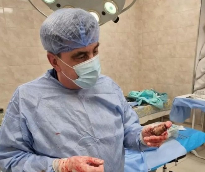 Στη δεύτερη εικόνα, φαίνεται ο χειρούργος που ανέλαβε την εγχείρηση, να κρατά στα χέρια του τη χειροβομβίδα, λίγο αφότου εκείνη αφαιρέθηκε.