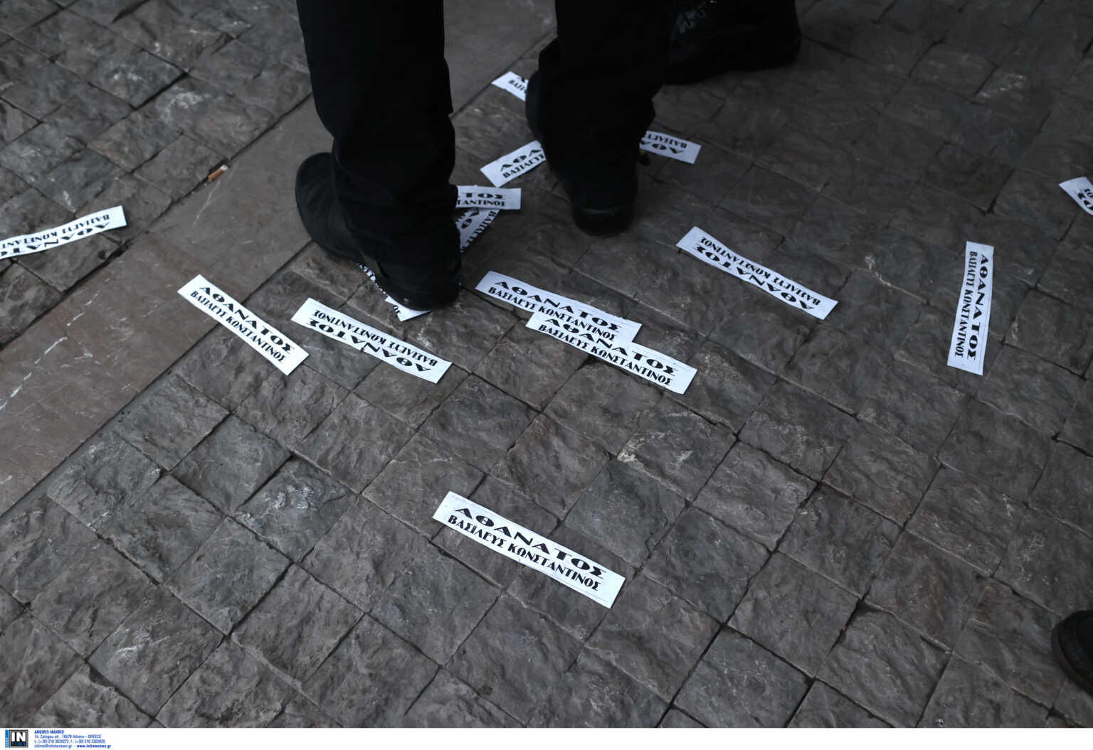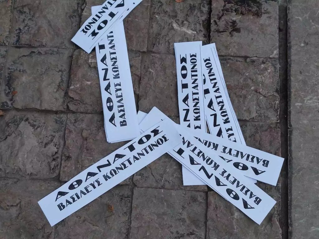Φώναξαν επίσης συνθήματα όπως «ζήτω ο Βασιλιάς» ενώ πέταξαν και φέιγ βολάν τα οποία έγραφαν «Αθάνατος-Βασιλεύς Κωνσταντίνος».