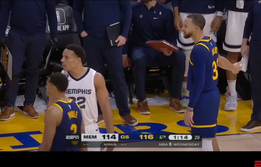 Με 1:14 να απομένουν για τη λήξη του παιχνιδιού, οι Γκόλντεν Στέιτ Γουόριορς προηγούνταν 114-112 των Μέμφις Γκρίζλις, αλλά, για το υπόλοιπο της αναμέτρησης χρειάστηκε να παίξουν χωρίς τον ηγέτη τους.