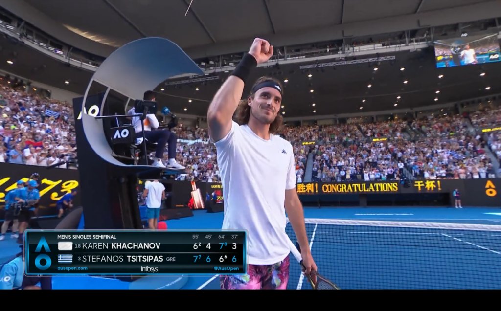 Πραγματοποιώντας εξαιρετική εμφάνιση, ο Τσιτσιπάς έκανε το 7-6, 6-4, 6-7, 6-3 απέναντι στον 26χρονο Ρώσο, και, στον δεύτερο grand slam τελικό της καριέρας του θα αντιμετωπίσει είτε τον Νόβακ Τζόκοβιτς, είτε τον Τόμι Πολ.