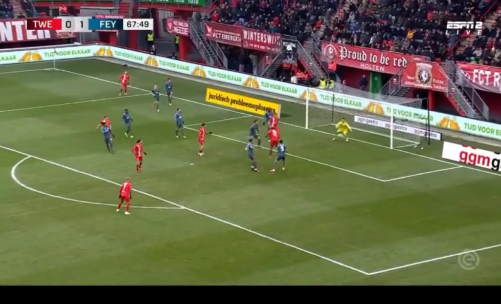 Δέκα λεπτά μετά την έναρξη του δευτέρου ημιχρόνου, το σουτ του Στέιν δεν προβλημάτισε τον τερματοφύλακα της Φέγενορντ και στη συμπλήρωση μιας ώρας αγώνα, ο γκολκίπερ της Τβέντε απέκρουσε σουτ του Γιαχανμπάνκς. Στο 61' και στο 67', ο Κοκτσού είχε τις ευκαιρίες να διπλασιάσει τα τέρματα της Φέγενορντ, δεν τα κατάφερε και στο 68ο λεπτό η Τβέντε βρήκε γκολ ισοφάρισης. Από αριστερά, ο Σαντιλέκ έκανε τη σέντρα και ο Μπρενέτ με κεφαλιά έστειλε την μπάλα στα δίχτυα για το 1-1. Στο τελευταίο δεκάλεπτο, οι δυο ομάδες έψαξαν το δεύτερο γκολ, δεν το βρήκαν και, στο φινάλε, πήραν από ένα βαθμό.