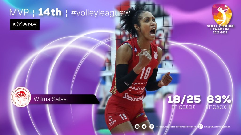 Είναι η πρώτη αθλήτρια του Ολυμπιακού τη φετινή σεζόν που παίρνει το βραβείο της πολυτιμότερης αθλήτριας. Η Βίλμα Σάλας στην εκτός έδρας νίκη με 3-0 σετ επί της Θέτιδας Βούλας ήταν η κορυφαία για τον Ολυμπιακό πετυχαίνοντας 18 πόντους με το εντυπωσιακό 72% στην επίθεση (18/25 τελειωμένες) και 46% άριστες υποδοχές σε 13 προσπάθειες με ένα μόλις λάθος.