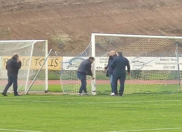 Οι γηπεδούχοι όμως δεν ξεκίνησαν να σκάβουν αυλάκι στη γραμμή και να το βάφουν για να μην φαίνεται. Μέσα στον χρόνο που τους δόθηκε έλυσαν το θέμα. Έβγαλαν τα δοκάρια από τη θέση τους και στις τρύπες έβαλαν πέτρες ώστε να σηκωθούν όσο χρειάζεται. Τα επανατοποθέτησαν και με σφήνες τα σταθεροποίησαν.