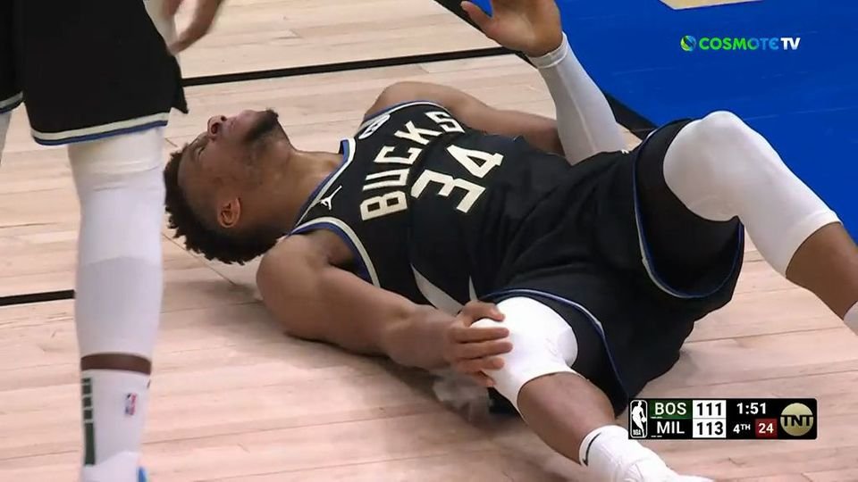 Ο Αντετοκούνμπο χτύπησε σε μια διείσδυση, έμεινε στο παρκέ, σφάδαζε, ενώ κρατούσε το δεξί του γόνατο, αλλά, τελικά, σηκώθηκε και συνέχισε το παιχνίδι