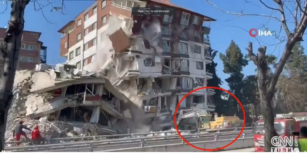 Ειδικότερα στο βίντεο διακρίνεται ένας εκσκαφέας που απομακρύνει μπάζα μπροστά απο ένα κτήριο στην περιοχή Χατάι, που έχει υποστεί αρκετές ζημιές απο το σεισμό.