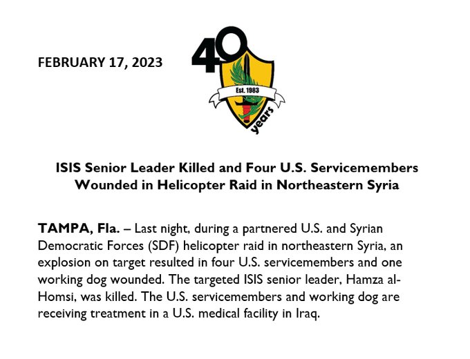 «Χθες το βράδυ, κατά τη διάρκεια επιδρομής ελικοπτέρου από τις ΗΠΑ και τις Συριακές Δημοκρατικές Δυνάμεις στη βορειοανατολική Συρία, μια έκρηξη στον στόχο είχε ως αποτέλεσμα να τραυματιστούν τέσσερις αμερικανοί στρατιώτες και ένας εκπαιδευμένος για εργασία σκύλος. Ο Χάμζα αλ Χόμσι σκοτώθηκε», αναφέρει η ανακοίνωση της Κεντρικής Διοίκησης των ΗΠΑ.