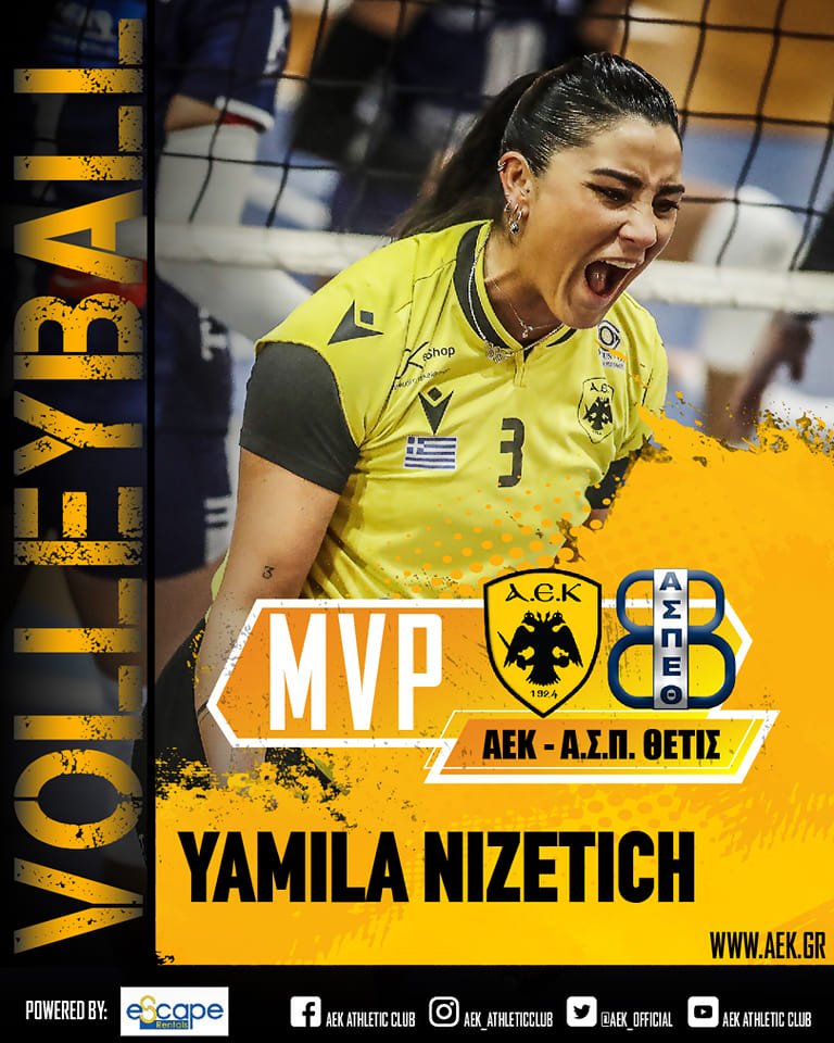 Η γυναικεία ομάδα βόλεϊ της ΑΕΚ επικράτησε και στο Πρωτάθλημα της Θέτιδας (3-0 σετ) στη Νέα Φιλαδέλφεια και πήρε ένα σημαντικό τρίποντο, με την Γιαμίλα Νίζετιτς να αναδεικνύεται κορυφαία του αγώνα. Η 32χρονη ακραία της Ένωσης μετά το τέλος του αγώνα κέρδισε τον τίτλο του «Escape Car Rentals» MVP, αφού πέτυχε 11 πόντους (7/19 επ., 3 άσσοι, 1 μπλοκ, 50% υπ. - 33% άριστες).