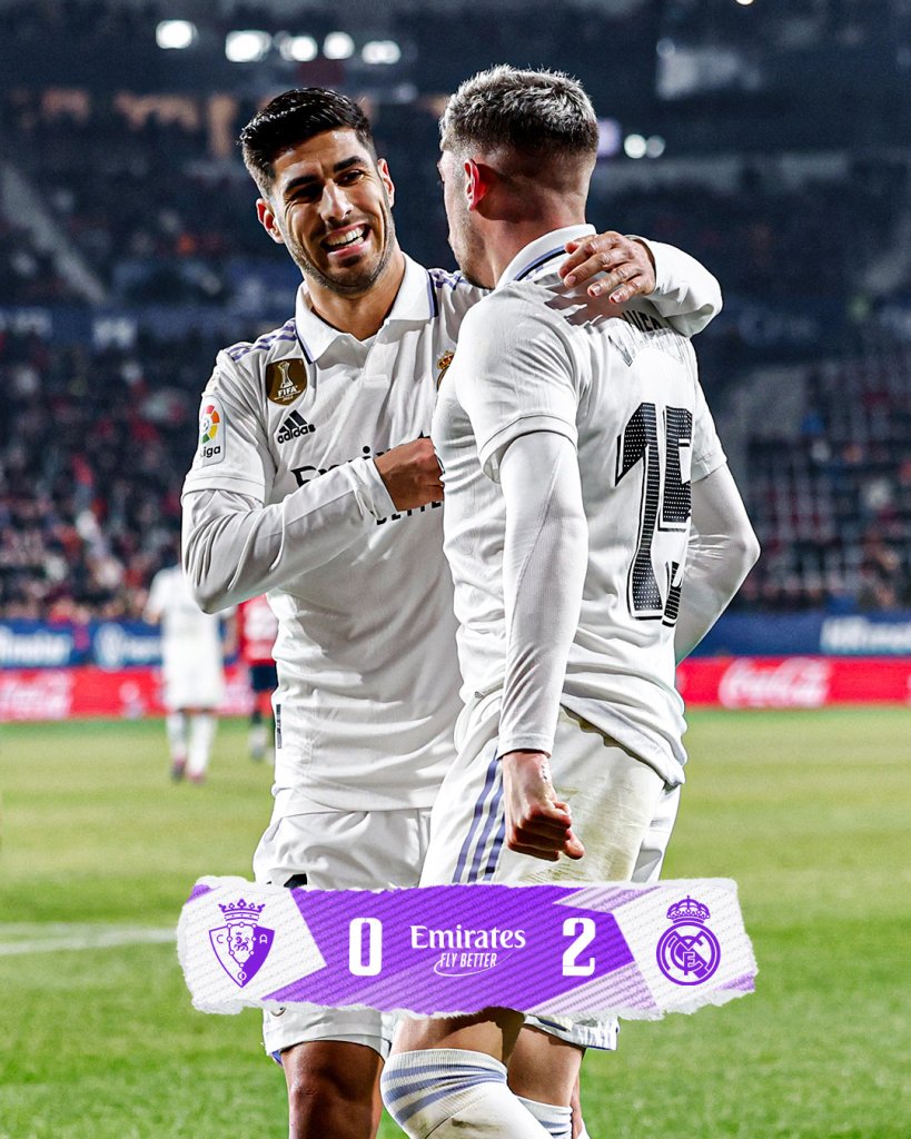Στο 74’ ο Βινίσιους βγήκε τετ-α-τετ με τον Ερέρα, όμως ο γκολκίπερ της Οσασούνα του είπε όχι, ενώ στο 78’ οι «μερένχες» κατάφεραν να βάλουν το πολυπόθητο γκολ. Ο Μόντριτς έβγαλε την κάθετη στον Βινίσιους, με τον Βραζιλιάνο να κάνει το γύρισμα από τα αριστερά και τον Βαλβέρδε να μπαίνει στην πορεία της μπάλας για να γράψει το 0-1. Στο 89’ ο Βίνισιους σκόραρε, όμως το γκολ ακυρώθηκε σωστά ως οφσάιντ, ενώ στο 90+2’ ο Ασένσιο δεν ήταν οφσάιντ και με ψύχραιμο τελείωμα έγραψε το τελικό 0-2.
