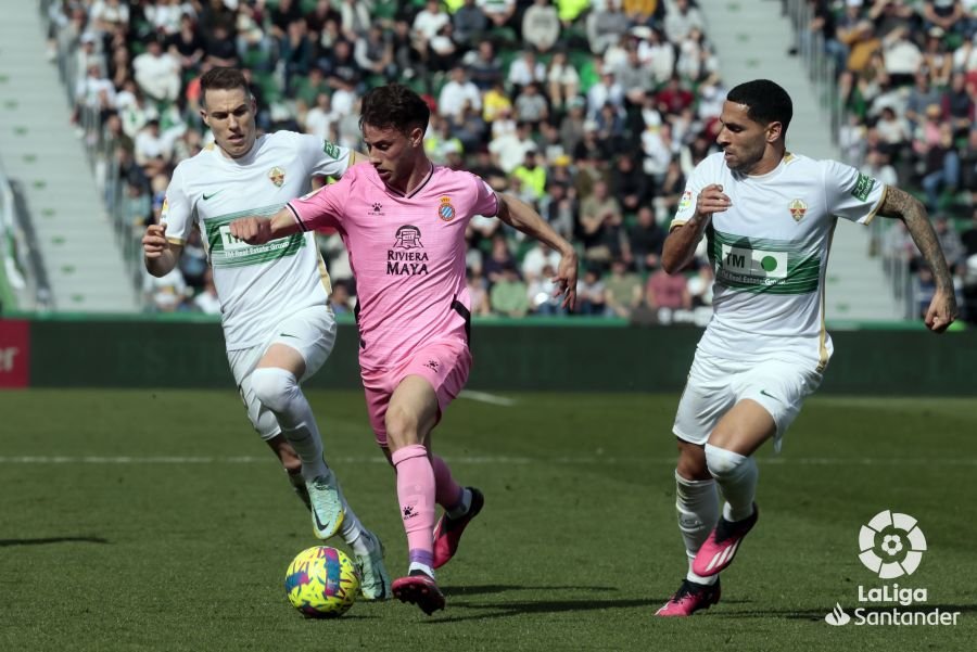 Στο 3ο λεπτό μετά από γλίστρημα του Μαγκαγιάν ο Πουάδο βρέθηκε μόνος με τον Μπαντία αλλά πάσαρε άστοχα και στο 9’ ο γκολκίπερ της Έλτσε είπε όχι σε σουτ του Μπρέθγουεϊτ ενώ στο 11’ ήταν η σειρά του Πατσέκο να βγάλει την κεφαλιά του Μασκαρέλ. Στο επόμενο λεπτό ο Πόνσε αστόχησε από καλή θέση και στο 13’ ο Ρόκο έσωσε στη γραμμή μετά από σουτ του Ντένις. Στο 24ο λεπτό ο γυριστό του Πόνσε από κοντέ, έξυσε το δοκάρι της Εσπανιόλ και στο 35’ ακυρώθηκε το γκολ του Καρμόνα. Στο 38ο λεπτό ο Παλάσιος έκανε το σουτ από το ύψος της περιοχής αλλά ο Πατσέκο μπλόκαρε
