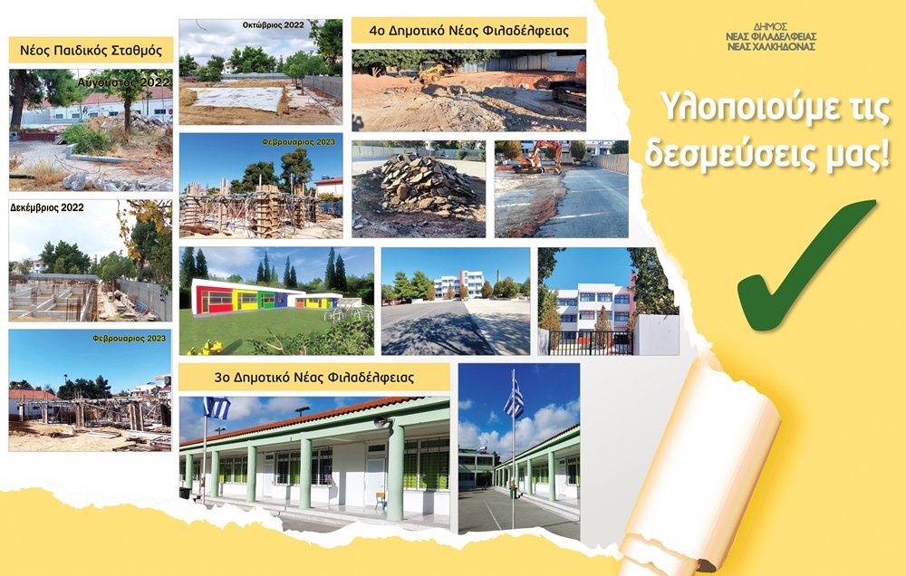 - Ολοκληρώθηκαν την Δευτέρα 20 Φεβρουαρίου 2023 οι εργασίες για την αποκατάσταση των μεγάλων προβλημάτων στον αύλειο χώρο του 4ου ΔημοτικούΣχολείου Νέας Φιλαδέλφειας (έργο που ανέμενε η σχολική μας κοινότητα για περισσότερα από 10 χρόνια).