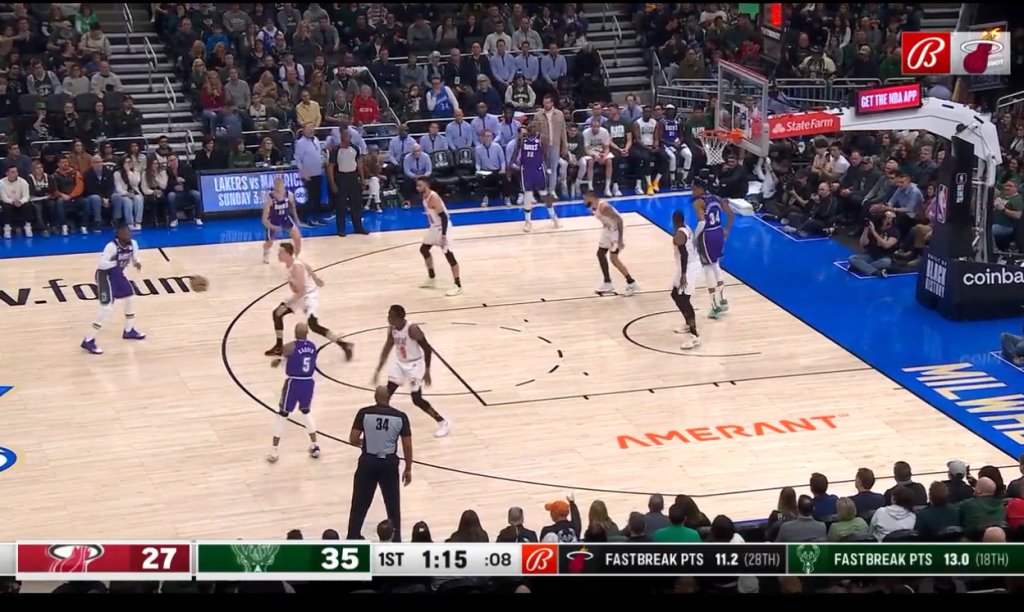 Με 1:22 για το τέλος της πρώτης περιόδου, στο παιχνίδι με τους Μαϊάμι Χιτ, ο Γιάννης Αντετοκούνμπο χτύπησε για τρίτη φορά, σε τρίτο διαφορετικό σημείο, σε τρεις διαφορετικές αναμετρήσεις.
