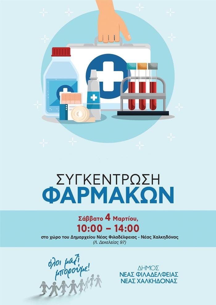 Ο Δήμος Νέας Φιλαδέλφειας – Νέας Χαλκηδόνας σε συνεργασία με το «ΟΛΟΙ ΜΑΖΙ ΜΠΟΡΟΥΜΕ» και την Διεύθυνση Κοινωνικής Πολιτικής, διοργανώνει δράση συγκέντρωσης φαρμάκων και υγειονομικού υλικού που θα διατεθεί στο Κοινωνικό Φαρμακείο της πόλης μας.