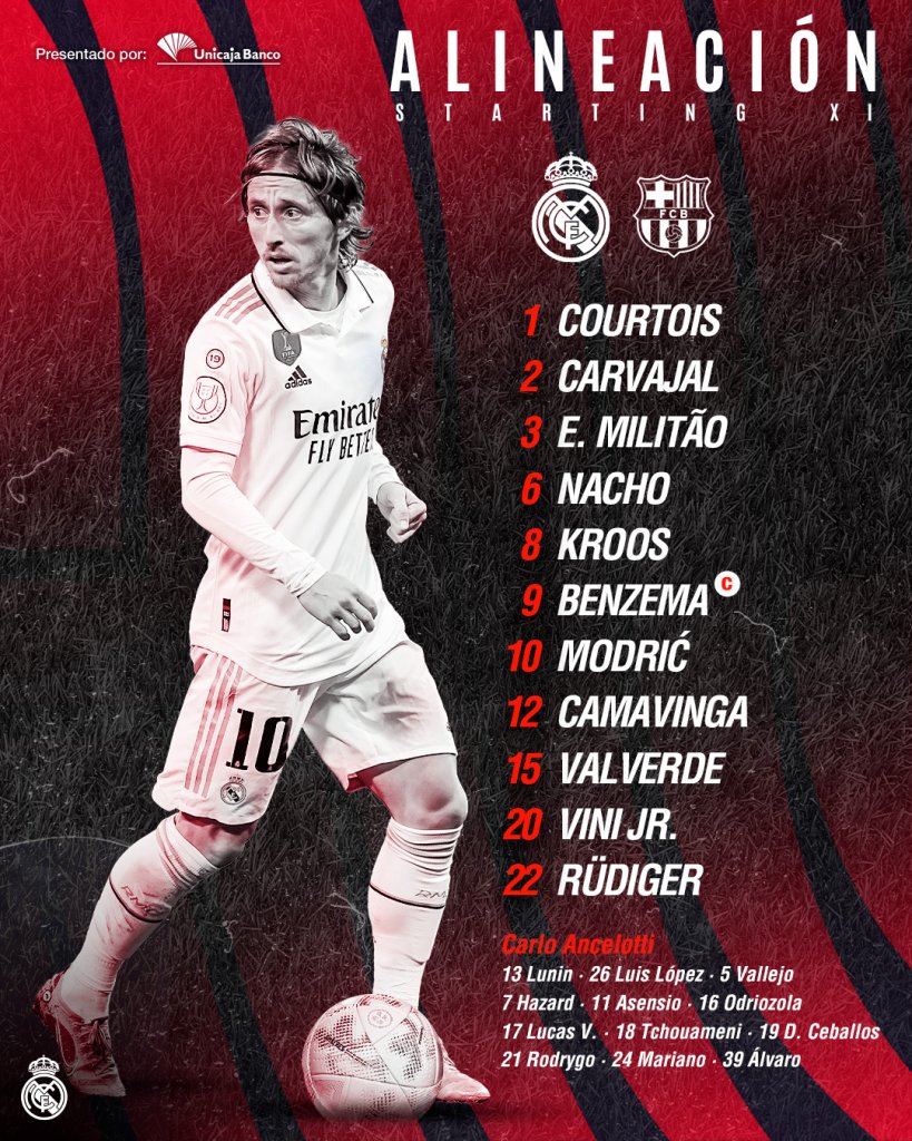 ΡΕΑΛ: Κουρτουά, Καρβαχάλ, Νάτσο, Μιλιτάο, Ρίντιγκερ, Κρόος, Μόντριτς, Καμαβινγκά, Βαλβέρδε, Βινίσιους, Μπενζεμά