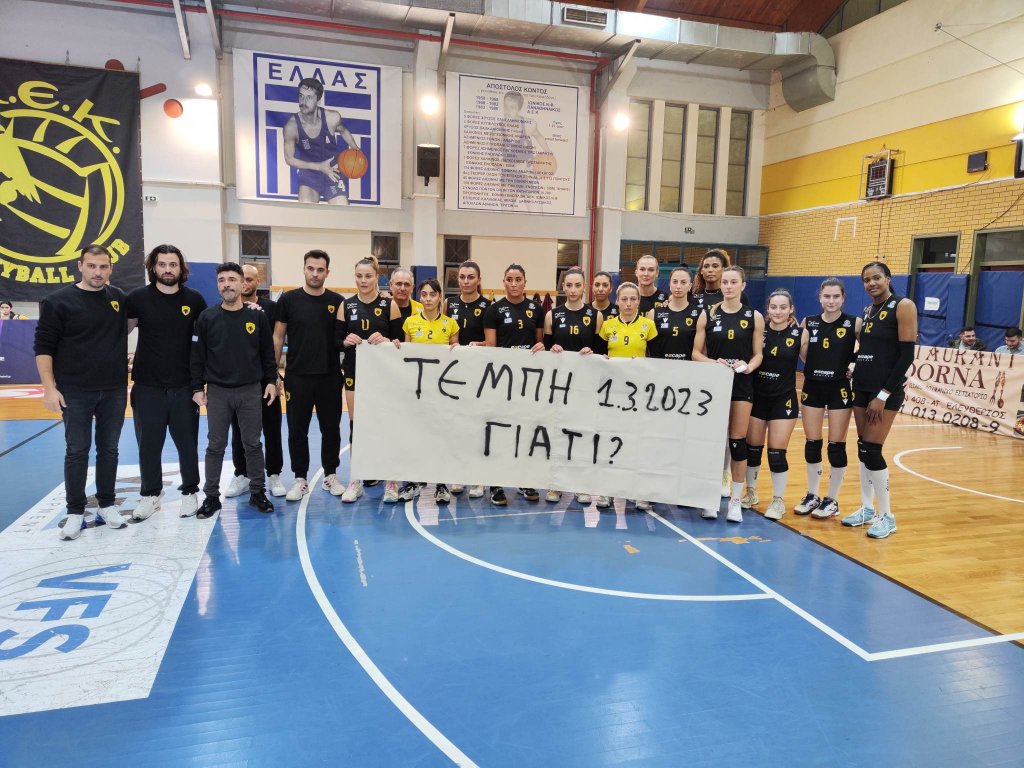 Ένα συγκινητικό μήνυμα για την τραγωδία στα Τέμπη έστειλε η γυναικεία ομάδα βόλεϊ της ΑΕΚ πριν από την έναρξη της αναμέτρησης με τον Ηλυσιακό στο κλειστό γήπεδο «Απ. Κόντος» για την 19η αγωνιστική του Πρωταθλήματος της Volley League. Συγκεκριμένα, τα κορίτσια της Ένωσης κρατούσαν ένα πανό στο οποίο έγραφε «Τέμπη 1/3/2023 Γιατί?».