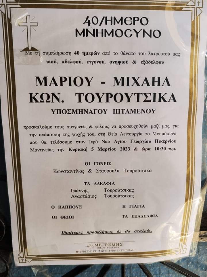Την Κυριακή (5/3), στον Ιερό Ναό Αγίου Γεωργίου Πικερνίου Μαντινείας, θα τελεστεί το Μνημόσυνο του Μάριου-Μιχαήλ Τουρούτσικα. Του ήρωα-Υποσμηναγού, που στις 30-01 πέταξε ψηλά σαν ΑΕΤΟΣ, μαζί με τον σμηναγό Ευστάθιο Τσιτλακίδη, μετά την πτώση του μοιραίου Phantom. Ο Μάριος-Μιχαήλ Τουρούτσικας θυμίζουμε, ήταν φίλος της ΑΕΚ…