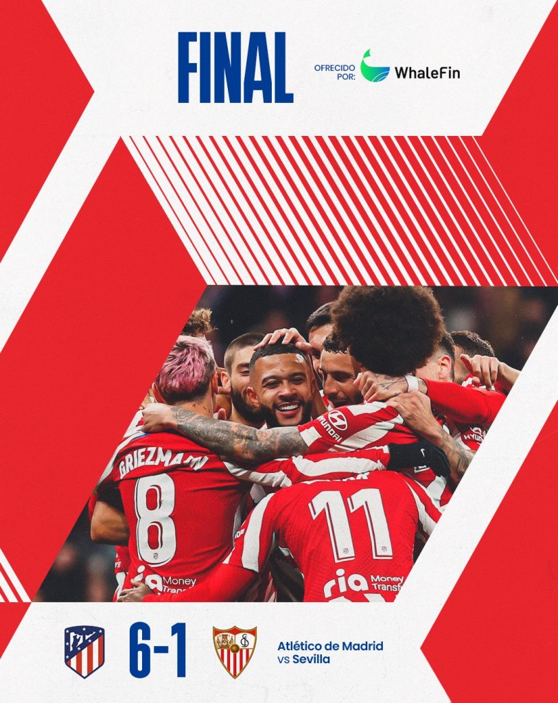 Τεράστια νίκη για την Ατλέτικο Μαδρίτης. Οι «ροχιμπλάνκος» εκμεταλλεύτηκαν την γκέλα της Σοσιεδάδ, επικράτησαν με 6-1 της Σεβίλλης στο «Wanda Metropolitano», και ανέβηκαν στην τρίτη θέση του βαθμολογικού πίνακα. Ιστορική βραδιά για τον Τσόλο Σιμεόνε που έφτασε τα 613 παιχνίδια στον πάγκο της Ατλέτικο Μαδρίτης και ξεπέρασε τον θρυλικό Λουίς Αραγονές.