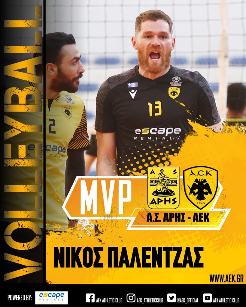 Η ανδρική ομάδα βόλεϊ της ΑΕΚ πήρε ένα σημαντικό διπλό στο κλειστό της Μίκρας επί του Άρη για την 16η αγωνιστική του Πρωταθλήματος της Pre League και ο Νίκος Παλέντζας κατάφερε να ξεχωρίσει με την εμφάνισή του. Ο παίκτης της ΑΕΚ γι΄αυτό το λόγο μετά το τέλος της αναμέτρησης αναδείχθηκε «Escape Car Rentals» MVP.
