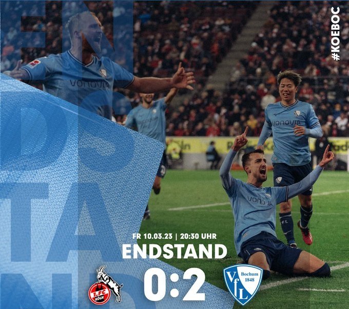 Πολύ μεγάλο διπλό για την Μπόχουμ που νίκησε με 2-0 την Κολωνία και έκανε σημαντικό βήμα παραμονής. Μόλις στο 7ο λεπτό οι φιλοξενούμενοι κέρδισαν το πρώτο τους πέναλτι στη σεζόν σε μαρκάρισμα του Χιούμπερς στον Αντβί-Αντζέι. Το εκτέλεσε ο Στέγκερ και έκανε το 0-1. Το δεύτερο γκολ ήρθε στο 76’ όταν με περιπετειώδη τρόπο η μπάλα έφτασε στον Μάσοβιτς και αυτός με πλασέ την έστειλε στο δοκάρι και τα δίχτυα.