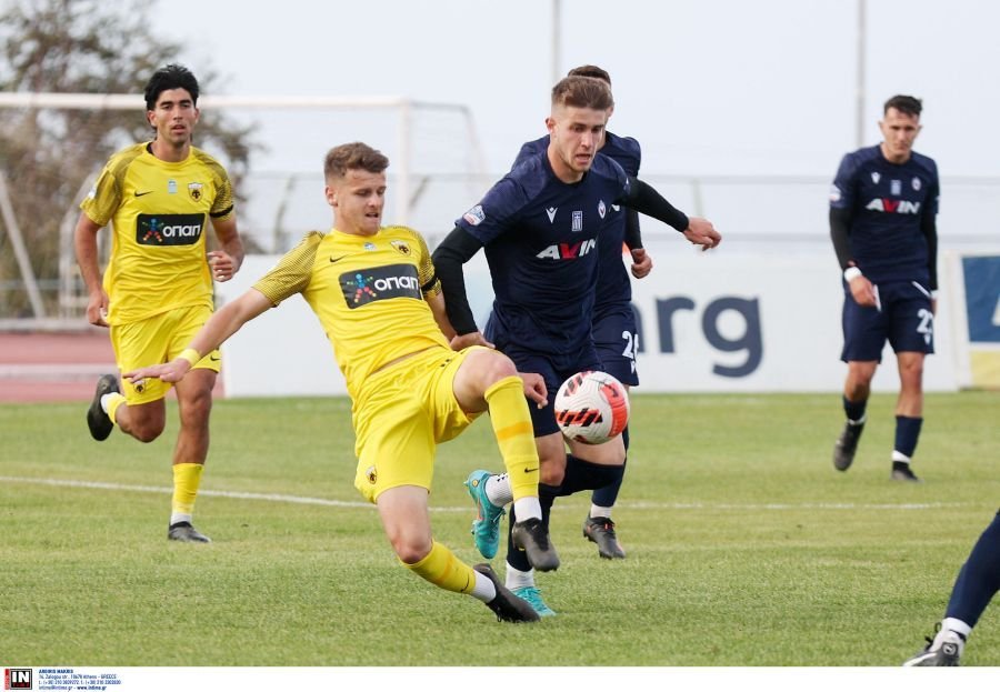 Στο πρώτο ημίχρονο, μια ομάδα υπήρχε στο γήπεδο και αυτή ήταν η ΑΕΚ Β. Αλλά η κυριαρχία των κιτρινόμαυρων δεν μετουσιώθηκε σε κάποιο γκολ. Πρώτη μεγάλη ευκαιρία του αγώνα και για την ΑΕΚ Β' στο 13' με τον Κοσίδη να τροφοδοτεί τον Κορομηλά κι εκείνος να σουτάρει απέναντι στον Ψαρρά με τον τελευταίο να αποκρούει σωτήρια. Καλό σουτ του Γκολφίνου στο 15' έξω από την περιοχή με τη μπάλα να περνάει όμως μακριά έξω από την εστία του Ψαρρά. Στο 18' το επικίνδυνο γύρισμα του Παρρά, απομάκρυνε ο Ψαρράς προ του Κοσίδη. Μέχρι το ημίχρονο, ο δυνατός αέρας δεν επέτρεψε να δούμε άλλες ευκαιρίες με την ΑΕΚ Β πάντως να πάτα καλύτερα και να έχει την κατοχή της μπάλας.