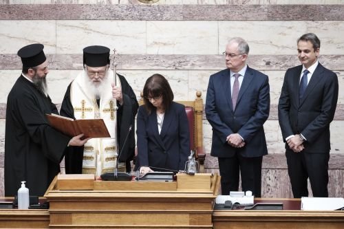 η Κατερίνα Σακελλαροπούλου ορκίζεται ως η πρώτη γυναίκα Πρόεδρος της Ελληνικής Δημοκρατίας στη Βουλή των Ελλήνων εν μέσω μέτρων για τον κοροναϊό. Δεν γίνονται χειραψίες ως μέρος των μέτρων.
