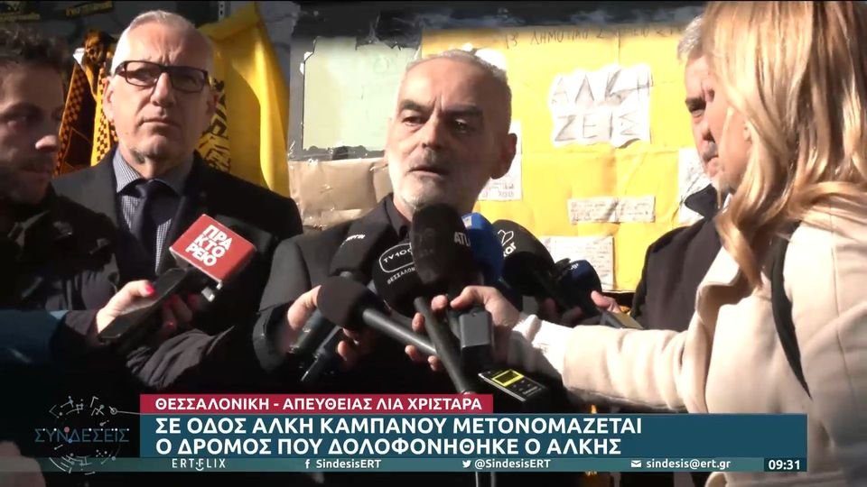 Σήμερα Τρίτη (14/3), σε μία ειδική εκδήλωση που στο σημείο της δολοφονίας του 19χρονου Άλκη Καμπανού, έγινε η μετονομασία της οδού Θ. Γαζή σε “Οδό Άλκη Καμπανού“. Εμφανώς συγκινημένος ο πατέρας του Άλκη, ευχαρίστησε τον κόσμο για την αγάπη του και παρακίνησε ώστε η θυσία του γιου του να αποτελέσει ένα νέο ξεκίνημα στον αθλητισμό, χωρίς καθόλου βία. “Η αγάπη του κόσμου με βοηθάει να το ξεπεράσω…όσο μπορώ”, είπε χαρακτηριστικά. Ο δήμαρχος Θεσσαλονίκης, Κωνσταντίνος Ζέρβας, τόνισε ότι είναι χρέος μας να κρατάμε ζωντανή την παρουσία του Άλκη, ο Άλκης να βρίσκεται ανάμεσά μας και αυτό το σημείο να θυμίζει για πάντα τον άδικο χαμό του. Νωρίτερα, με δάκρυα στα μάτια, ο Αριστείδης και η Μελίνα Καμπανού άφησαν λίγα λουλούδια στα σκαλιά όπου άφησε την τελευταία του πνοή ο μονάκριβος γιος τους.
