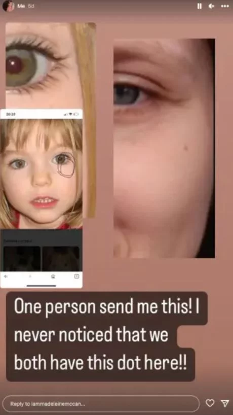 «Έχω παρόμοια μάτια, σχήμα προσώπου, αυτιά, χείλη, είχα το κενό ανάμεσα στα δόντια [όπως η Madeleine]», έγραψε σε μια ανάρτηση, με φωτογραφίες της ίδιας και του παιδιού που απήχθη, δίπλα δίπλα.