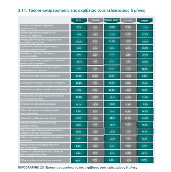Οι καταναλωτές που μείωσαν το ποσοστό θέρμανσης της κατοικίας τους σε μεγάλο βαθμό αποτελούν το 86,8%. 8 στους 10 επιλέγει να φορά περισσότερα ρούχα για να αποφεύγει τη δαπάνη της θέρμανσης. Το 91,3% χαμηλώνει ή κλείνει τη θέρμανση τις νυχτερινές ώρες του ύπνου.