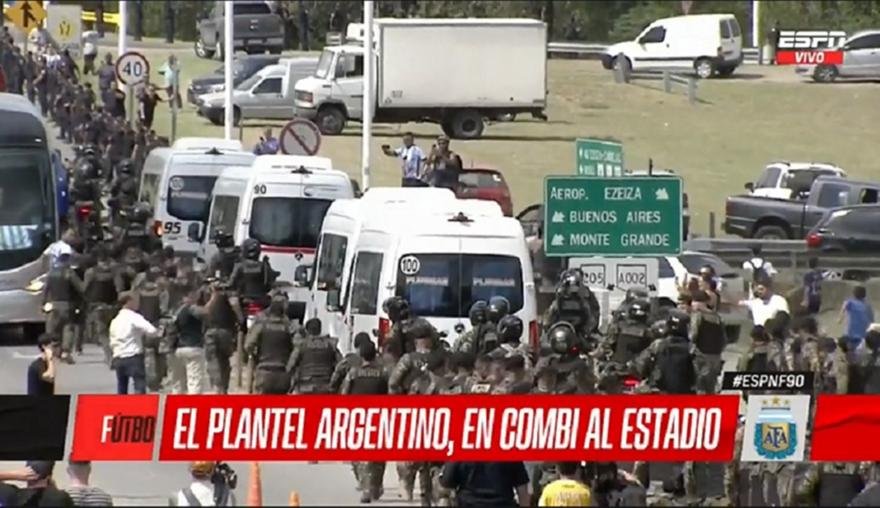 Η αποστολή της παγκόσμιας πρωταθλήτριας έχει ήδη ξεκινήσει με πολλά βανάκια για το «Μονουμεντάλ», με πολύ ισχυρές αστυνομικές δυνάμεις να τη συνοδεύουν. Υπάρχουν χιλιάδες αστυνομικοί στους δρόμους, όπου ρυθμίζουν τα πάντα ώστε ο κόσμος να μην πλησιάσει το… κομβόι της εθνικής Αργεντινής.