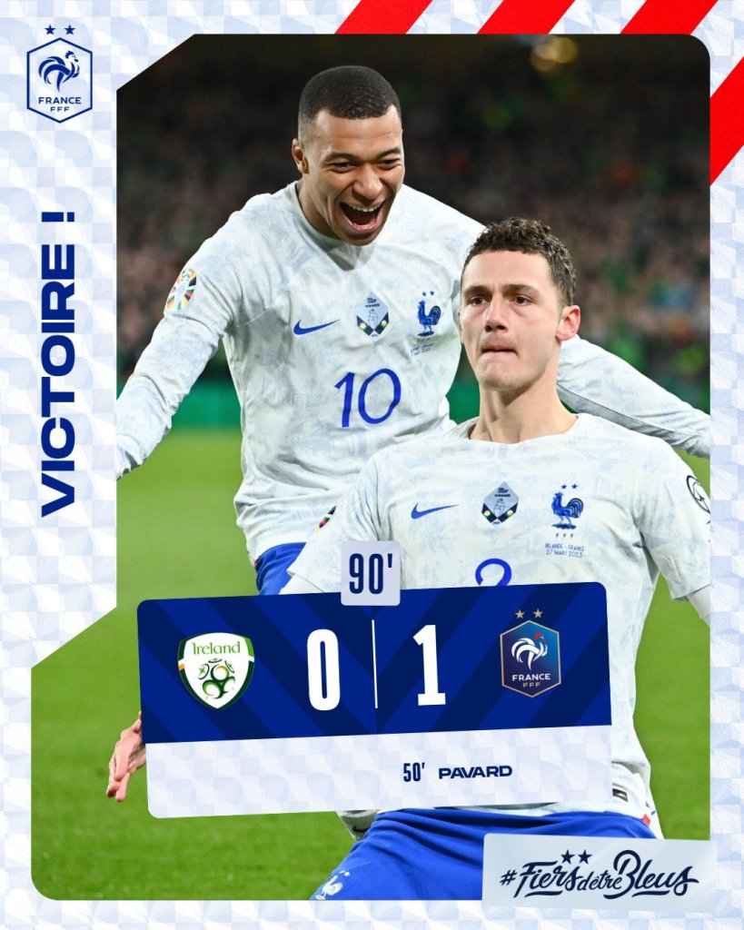 Οι δύο ομάδες ξεκίνησαν το δεύτερο ημίχρονο χωρίς αλλαγές. Η Γαλλία με το «καλημέρα» βρήκε το γκολ που έψαχνε σε ολόκληρο το πρώτο σαρανταπεντάλεπτο. Ο Παβάρ στο 50’ με μια «οβίδα» εκτός περιοχής κεραυνοβόλησε τον Μπαζούνου και με αυτό το εντυπωσιακό γκολ, οι Γάλλοι ξεκλείδωσαν την άμυνα των Ιρλανδών. Μετά το πρώτο γκολ της αναμέτρησης, οι γηπεδούχοι βγήκαν από το καβούκι τους και το παιχνίδι απέκτησε πιο γρήγορο ρυθμό. Η επόμενη καλή φάση έγινε στο 69ο λεπτό, όταν ο Ντιαμπί, μετά ατομική προσπάθεια από τα δεξιά σούταρε με τον τερματοφύλακα των γηπεδούχων να αποκρούει με δυσκολία. Τα λεπτά κυλούσαν χωρίς ευκαιρίες μέχρι και το 84’. Αυτή τη φορά ήταν η σειρά των Ιρλανδών να απειλήσουν, αφού το γύρισμα του Μακλίν από τα αριστερά, ανάγκασε τον τερματοφύλακα της Γαλλίας να επέμβει και να βγάλει την μπάλα κόρνερ. Οι Ιρλανδοί συνέχισαν να πιέζουν και έφτασαν κοντά στο γκολ στο 89. Ο Κόλινς μετά από κόρνερ έπιασε την κεφαλιά και ο Μενιάν με μια εκπληκτική απόκρουση κράτησε τη νίκη για την ομάδα του.