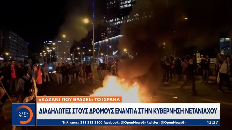 Όλο και πιο βαθιά στην πολιτική κρίση βυθίζεται το Ισραήλ, με τις μαζικές διαδηλώσεις κατά της κυβέρνησης Νετανιάχου να μην έχουν τέλος, εδώ και 13 εβδομάδες. Αν και χθες ο Πρωθυπουργός πάγωσε τη δικαστική μεταρρύθμιση που προωθεί εδώ και καιρό, οι πολίτες εμφανίζονται δύσπιστοι, με αποτέλεσμα τα μεγάλα αστικά κέντρα της χώρας να μετατρέπονται ξανά σε πεδίο μάχης