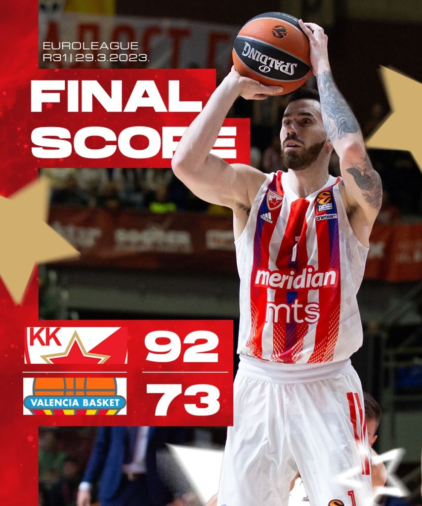 Παρ' ότι οι πιθανότητες δεν ειναι με το μέρος του, ο Ερυθρός Αστέρας όσο κερδίζει μένει «ζωντανός» για τα πλέι οφ. Η ομάδα του Ντούσκο Ιβάνοβιτς αντιμετώπισε την Βαλένθια και έφτασε σε ακόμα μια νίκη, ανεβαίνοντας στο 14-17, πιάνοντας την ισπανική ομάδα στην κατάταξη.