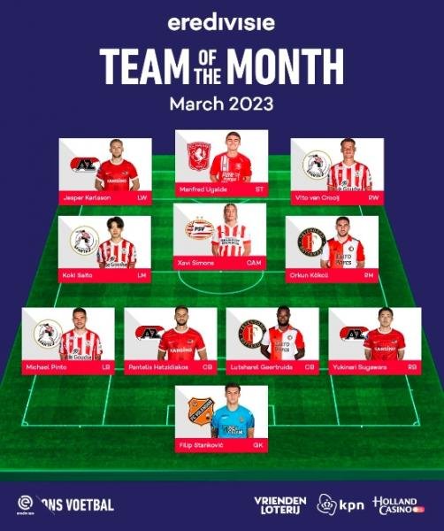 Οι 11 κορυφαίοι της Eredivisie προέρχονται από έξι διαφορετικές ομάδες, ενώ Σπάρτα Ρότερνταμ και Άλκμααρ εκπροσωπούνται από τρεις παίκτες στη συγκεκριμένη λίστα.