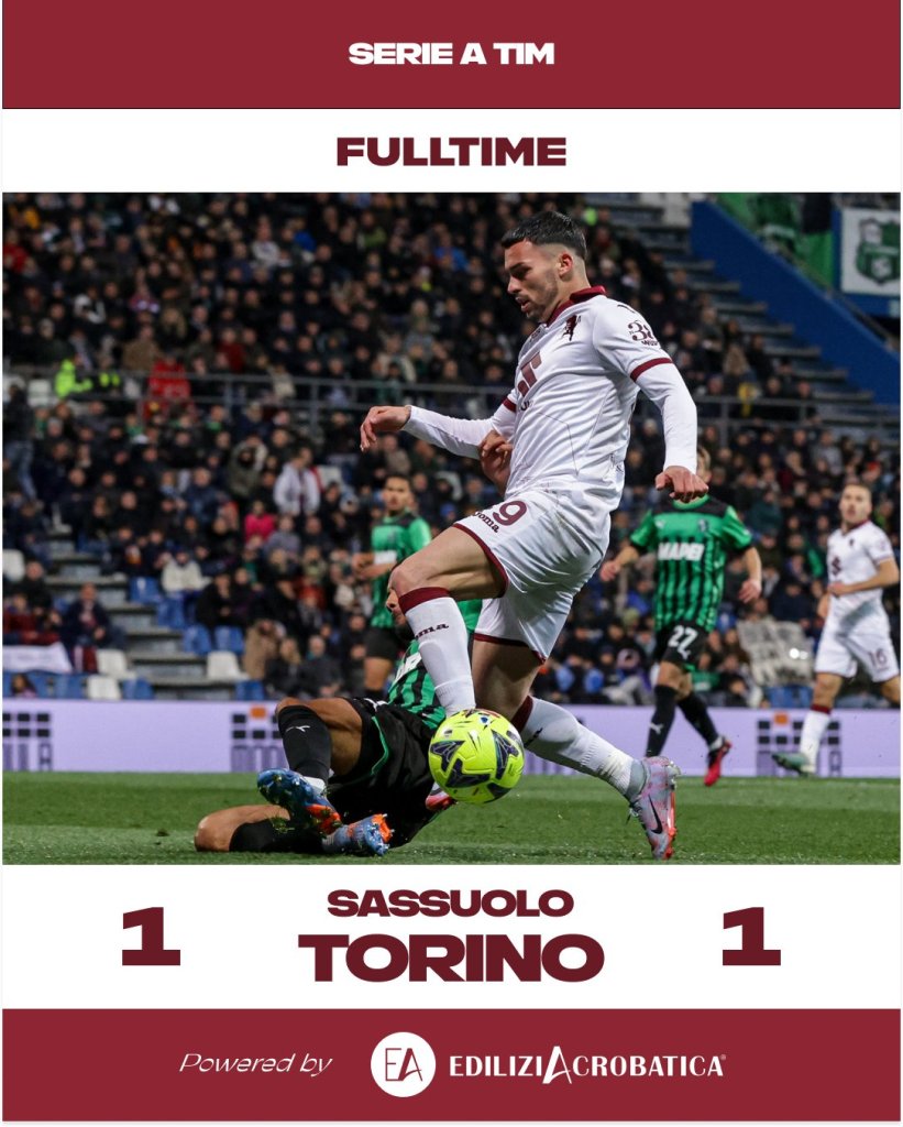 Τη (σχεδόν) κοινή τους πορεία στο φετινό Καμπιονάτο συνεχίζουν Σασουόλο και Τορίνο που ήρθαν ισόπαλες 1-1 και βρίσκονται στη μέση της βαθμολογίας με έναν βαθμό να τους χωρίζει. Πάμπολλες ευκαιρίες από την Τορίνο που την αδικεί το αποτέλεσμα.