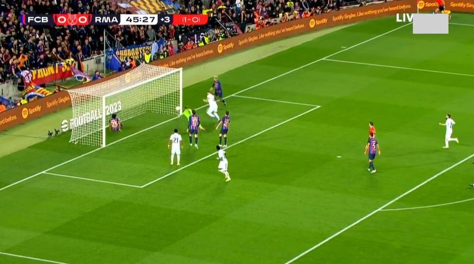 Στο 45+2’ ο Κουρτουά είπε όχι εντυπωσιακά σε σουτ του Λεβαντόφσκι, η Ρεάλ έφυγε στην κόντρα, ο Βινίσιους άλλαξε με τον Μπενζεμά και πλάσαρε από το πέναλτι. Η μπάλα κόντραρε στον Μπαλντέ αλλά ο Γάλος φορ την έσπρωξε στα δίχτυα από κοντά για το 0-1.