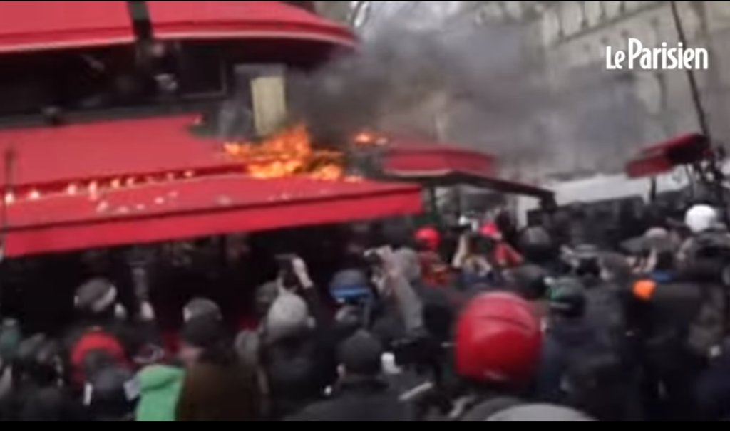 Διαδηλωτές συγκρούστηκαν στο Μονπαρνάς στο Παρίσι με δυνάμεις ασφαλείας με αποτέλεσμα να πιάσει φωτιά η τέντα του αγαπημένου εστιατορίου του Μακρόν, της μπρασερί “La Rotonde” όπου είχε οργανώσει ένα εορταστικό δείπνο μετά τον πρώτο γύρο των προεδρικών εκλογών του 2017. Το ίδιο εστιατόριο είχε πιάσει φωτιά και το 2020 στη διάρκεια των διαδηλώσεων των «Κίτρινων Γιλέκων».