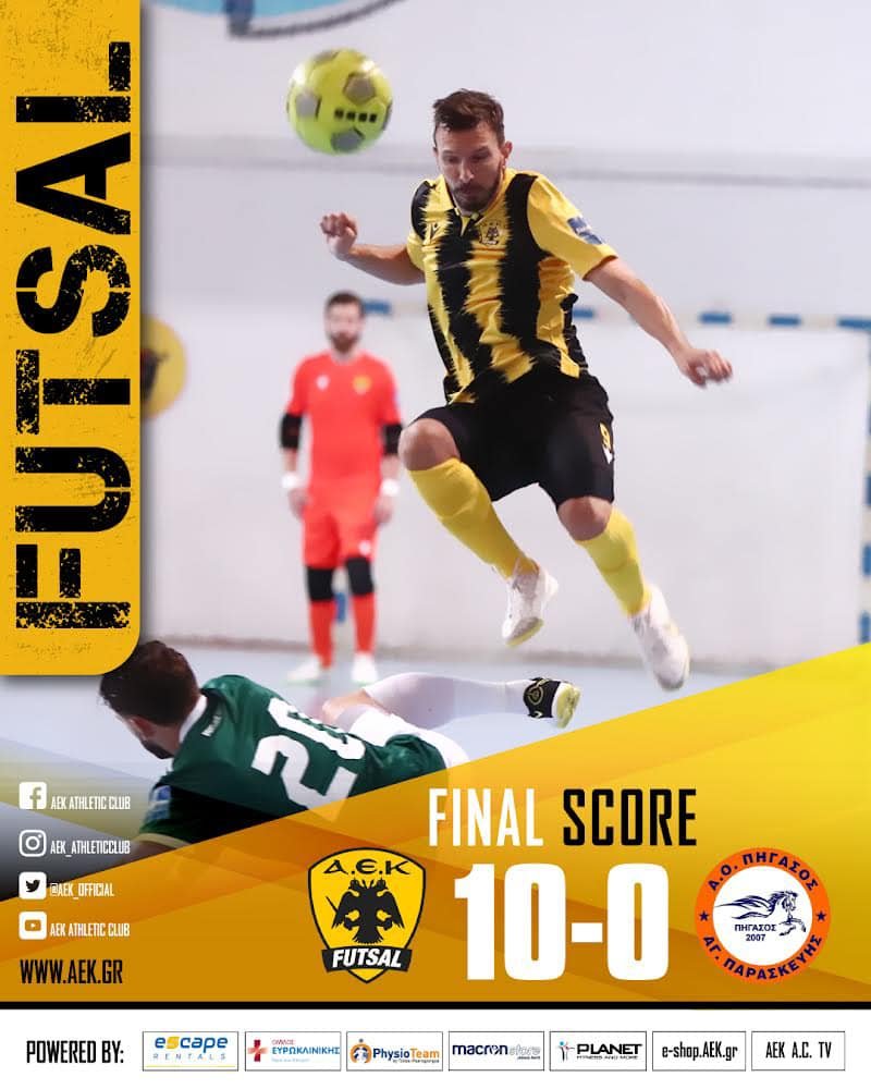 Η ομάδα ποδοσφαίρου σάλας της ΑΕΚ διέλυσε με 10-0 τον Πήγασο Αγίας Παρασκεύης για τον πρώτο ημιτελικό του Κυπέλλου Ελλάδος και πήρε την πρόκριση στον τελικό της διοργάνωσης.