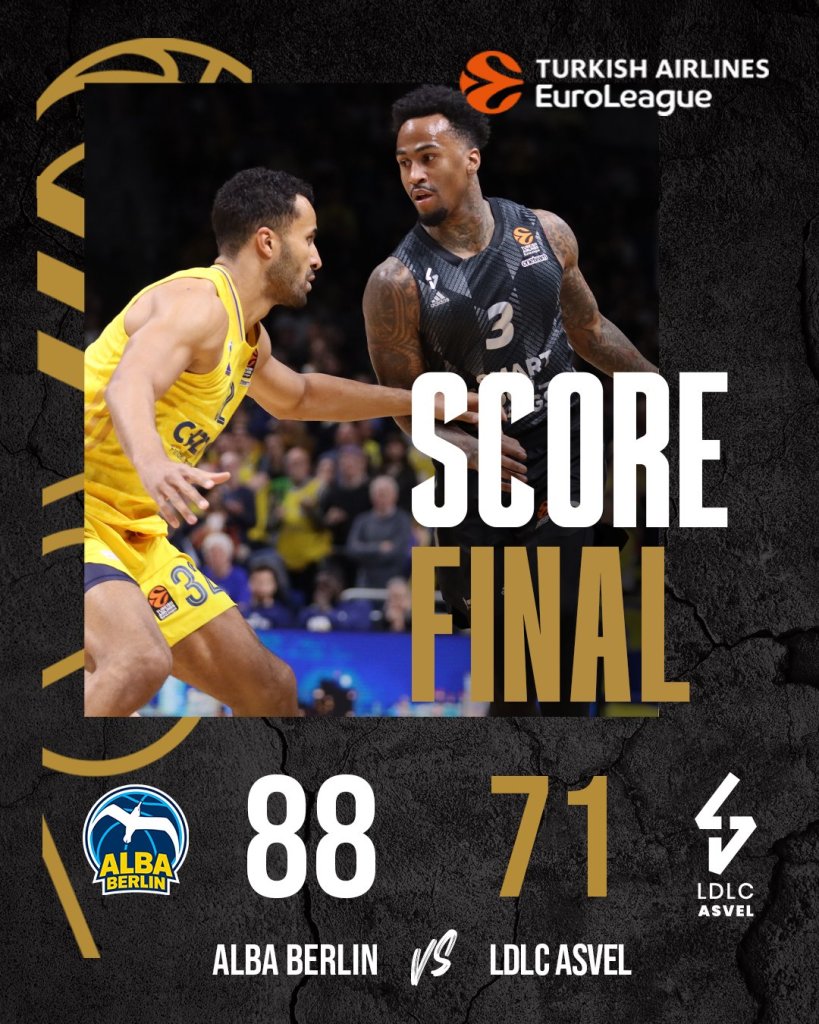 Η Άλμπα υπέταξε τη Βιλερμπάν με 88-71 στην 34η και τελευταία αγωνιστική της EuroLeague, κλείνοντας τη σεζόν με back-to-back νίκες και υποχρεώνοντας τους Γάλλους στη 13η συνεχόμενη ήττα τους.