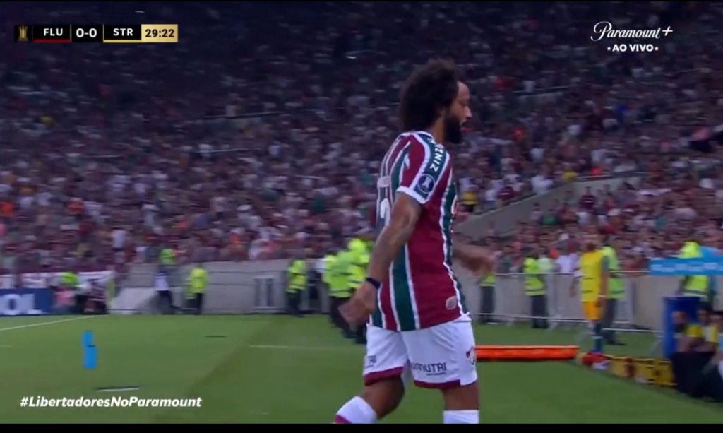 Marcelo sente desconforto e vira baixa para o Fluminense logo no primeiro tempo... John Kennedy entra no lugar do camisa 12 #LibertadoresNoParamount pic.twitter.com/zb84ZtalDC