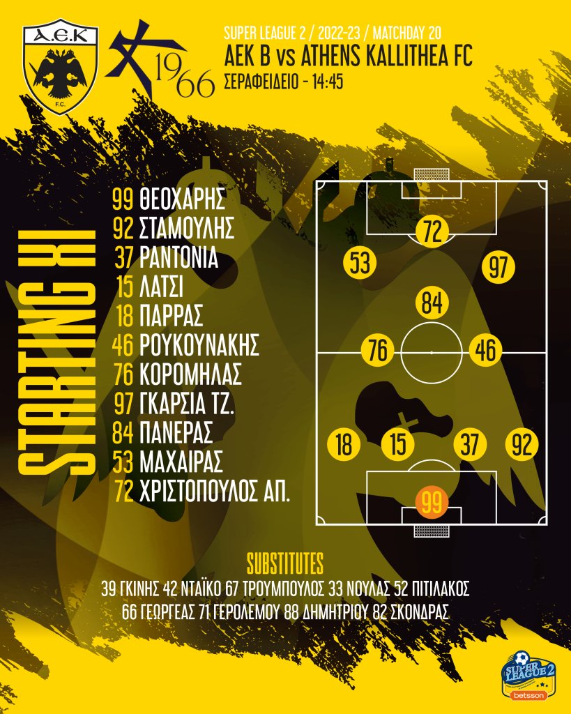 Εγινε γνωστή η ενδεκάδα της ΑΕΚ Β' για τον αγώνα με την Καλλιθέα που ξεκινά στο Σεραφείδειο στις 14:45. Ο Σωκράτης Οφρυδόπουλος, ξεκινά με τον Θεοχάρη στα δοκάρια, τους Σταμούλη, Ραντόνια, Λάτσι και Παρρά στην άμυνα, τους Ρουκουνάκη - Κορομηλα στα χαφ, τον Πανερά ελεύθερο, τους Τζούντα Γκαρσία - Μαχαίρα στα άκρα και τον Απ. Χριστόπουλο στη γραμμή κρούσης.