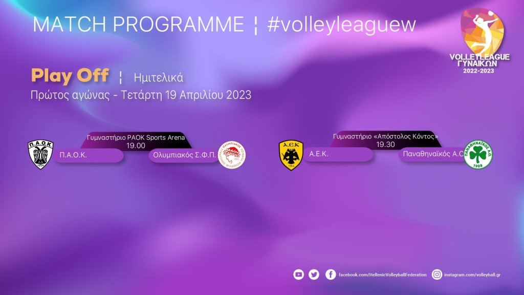 Το πρώτο σερβίς στους ημιτελικούς (οι σειρές κρίνονται στις δύο νίκες) θα δοθεί στο PAOK Sports Arena (19:00) όπου ο ΠΑΟΚ (πρώτος στην κανονική περίοδο) υποδέχεται τον Ολυμπιακό (τέταρτος στην κανονική περίοδο) με τις δύο ομάδες να μετρούν από μία νίκη στις φετινές τους αναμετρήσεις.