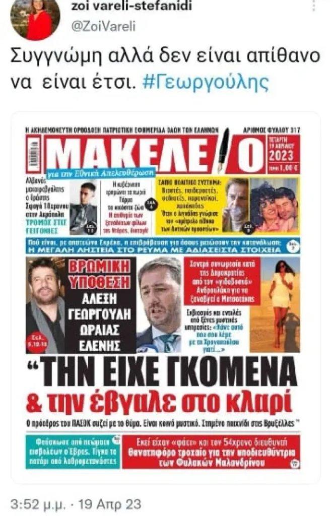 Έντονες αντιδράσεις προκάλεσε η υποψήφια βουλευτής του ΣΥΡΙΖΑ Ζωή Βαρέλη-Στεφανίδη (μητέρα της Κατερίνας Στεφανίδη) η οποία υιοθέτησε χυδαίο πρωτοσέλιδο του «Μακελειού» που αναφέρεται στην υπόθεση Γεωργούλη και την καταγγελία για βιασμό και ξυλοδαρμό που έκανε σε βάρος του η δικηγόρος και στέλεχος του ΠΑΣΟΚ Ελένη Χρονοπούλου.