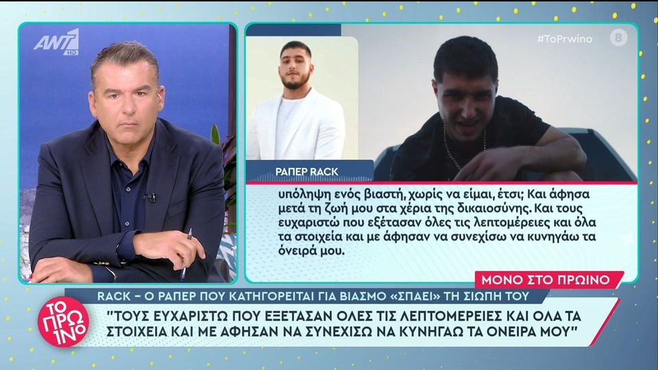 Ο ράπερ Rack ο οποίος καταγγέλθηκε για βιασμό από 19χρονη φοιτήτρια, "έσπασε τη σιωπή του" και μίλησε δημόσια για τα πάντα. Μιλώντας στην εκπομπή "Πρωινό" του ΑΝΤ1 υποστηρίζει ότι η 19χρονη ήθελε να συνευρεθεί ερωτικά μαζί του και εκείνος δεν ήταν σε τέτοια διάθεση: «Πήγα για συναυλία στο Ρέθυμνο, εγώ κατάγομαι από την Κρήτη, από τα Σφακιά. Πριν πάμε στο ξενοδοχείο πήραμε πράγματα να φάμε. Εμένα ο σκοπός μου ήταν να πάμε στο ξενοδοχείο, να φάμε και να κοιμηθούμε. Πήγαμε λοιπόν στο ξενοδοχείο, ένας φίλος μου είχε μια επαφή με μια κοπέλα από το κλαμπ, την καλεί να έρθει, αυτή αποδεικνύεται ότι, μετά το καταλάβαμε όλοι, ότι δεν είχε ερωτική διάθεση να κάνει κάτι με τον φίλο μου αλλά είχε με εμένα, που εγώ δεν ήθελα, γιατί άμα ήθελα θα ήμουν σε πάρα πολύ άσχημη κατάσταση αυτή τη στιγμή. Θα φαινόμουν ένοχος, γιατί η κοπέλα από τη στιγμή που ήθελε να κάνει κάτι, πάλι μέχρι να αποδειχθεί το αντίθετο εγώ θα φαινόμουν ένοχος. Τρομάζω στη σκέψη τι θα μπορούσε να πει σε περίπτωση που κάτι γινόταν. Δεν το πιστεύω δηλαδή αυτό το πράγμα!».