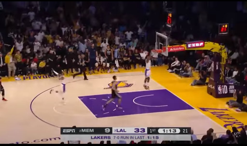 Στην Crypto.com Arena, οι φίλοι των Λέικερς γέμισαν τις εξέδρες και είδαν την αγαπημένη τους ομάδα να είναι καταιγιστική, στην πρώτη περίοδο, και να προηγείται 35-9 στο 12ο λεπτό. Στο ίδιο διάστημα, οι Γκρίζλις είχαν 3/25 σουτ και έξι λάθη. Η ομάδα του Λος Άντζελες συνέχισε στον ίδιο ρυθμό, με αποτέλεσμα, η διαφορά να ανέβει στους 29 πόντους, 42-13, 9:05 πριν το τέλος του ημιχρόνου. Από εκείνο το σημείο, οι Γκρίζλις βελτίωσαν τα ποσοστά ευστοχίας τους, έπαιξαν και καλύτερη άμυνα, με αποτέλεσμα να κλείσουν την δεύτερη περίοδο με σερί 10-0, για το 53-37. Στα 17 δευτερόλεπτα μετά την έναρξη της επανάληψης, καταγράφεται το νέο επεισόδιο στην κόντρα, που έχει ξεσπάσει, ανάμεσα σε Ντίλον Μπρουκς και Λεμπρόν Τζέιμς. Ο φόργουορντ των Γκρίζλις, στην προσπάθειά του να κλέψει την μπάλα, χτύπησε στα γεννητικά όργανα τον ηγέτη των Λέικερς, με αποτέλεσμα να αποβληθεί. Οι Λέικερς συνέχισαν να ελέγχουν το παιχνίδι, είχαν αποκτήσει προβάδισμα 20 πόντων, 88-68. Στο τελευταίο 12λεπτο, ο Ζα Μοράντ, στην επιστροφή του στη δράση, έβαλε 22 πόντους, όμως, ήταν, ήδη αργά, με τους Γκρίζλις το μόνο που κατάφεραν ήταν να κατεβάσουν τη διαφορά στους 13 πόντους, το τελευταίο δίλεπτο.