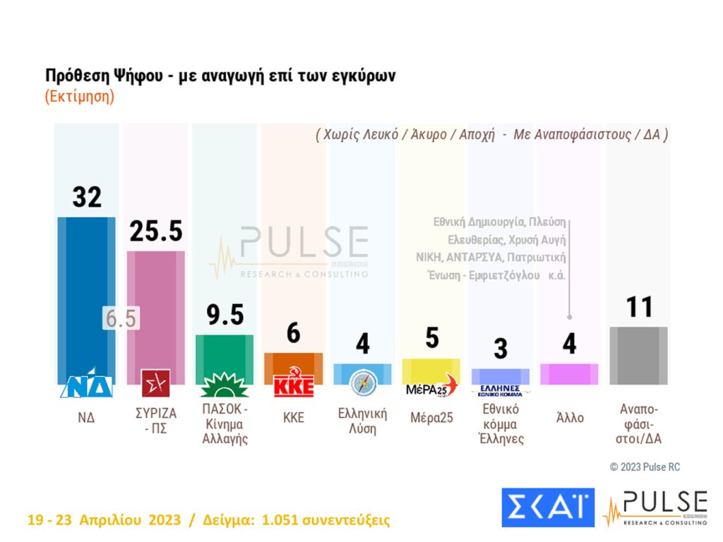 Στην πρόθεση ψήφου με αναγωγή επί των εγκύρων η Νέα Δημοκρατία έχει διαφορά 6,5% έναντι του ΣΥΡΙΖΑ με 32% και 25,5% αντίστοιχα. Ακολουθεί το ΠΑΣΟΚ με 9,5%, το ΚΚΕ με 6%, το ΜέΡΑ25 με 5%, η Ελληνική Λύση με 4% και το κόμμα Έλληνες με 3%. Άλλο κόμμα λέει το 4% και οι αναποφάσιστοι φτάνουν το 11%.