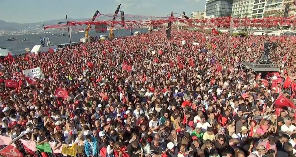 Πάνω από 1 εκατομμύριο άνθρωποι εκτιμάται ότι συγκεντρώθηκαν στην ιστορική προκυμαία της Σμύρνης σε ένα «κόκκινο ποτάμι της δημοκρατίας», όπως το χαρακτήρισαν πολλοί οπαδοί της αντιπολίτευσης, για την ομιλία του ηγέτη της Κεμάλ Κιλιτσντάρογλου.